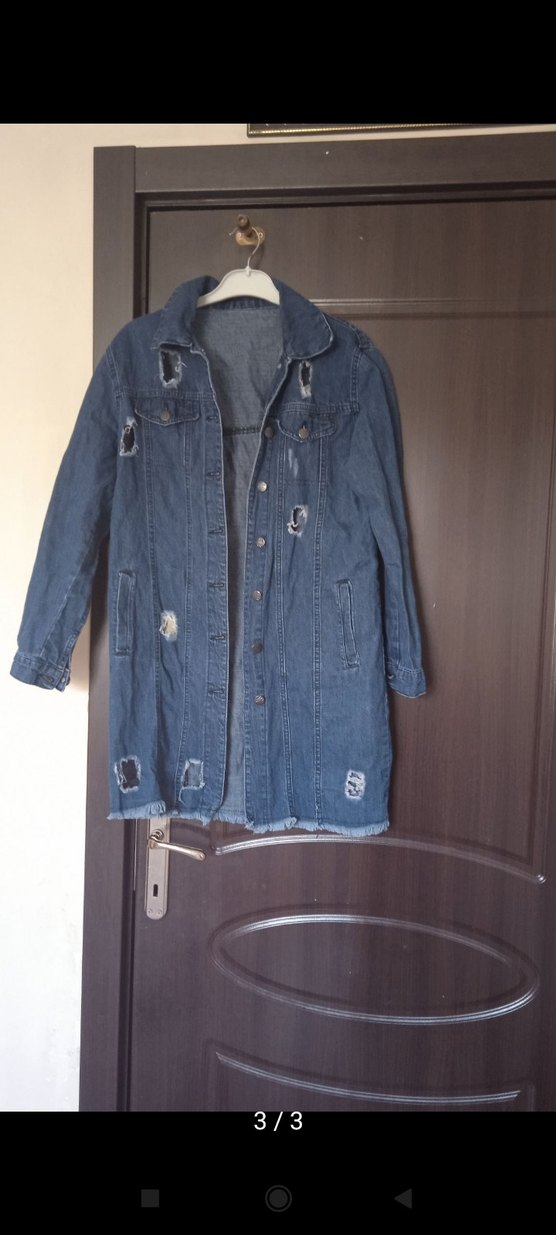 Düğmeli, cepli ve uzun kollu mavi denim ceket. Salaş kesimi ve yıpranmış detaylarıyla gündelik sokak stiline uygun.az kullanıldı bı sorunu yok iki kol arası 49 boy 83 rengi iki i fotodaki gibi