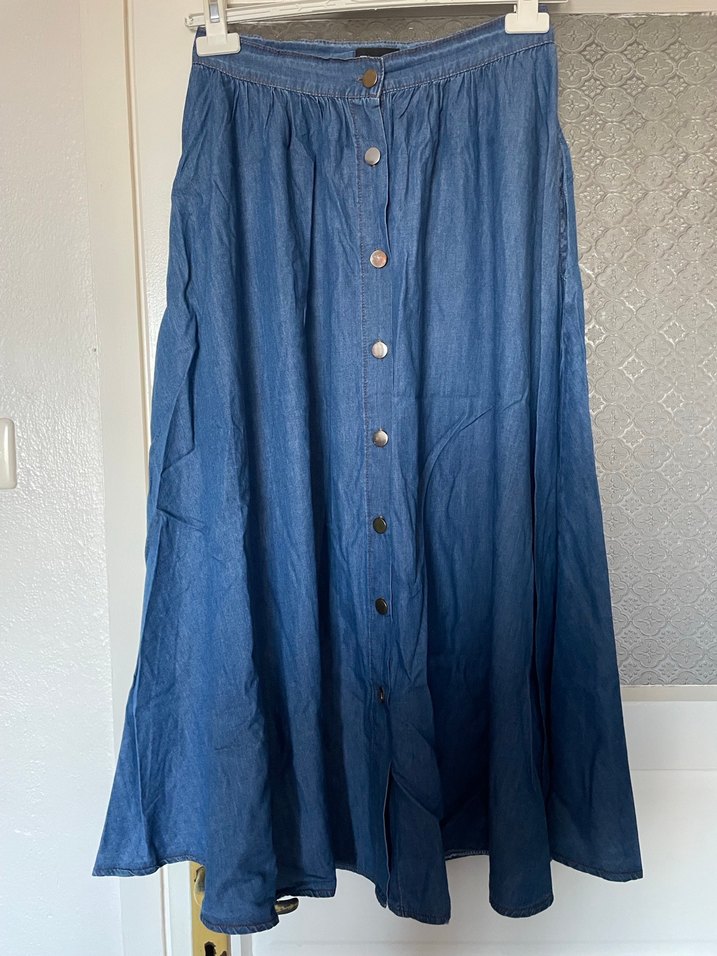 Düğmeli uzun mavi denim etek, bol kesim ve bohem tarzıyla dikkat çeker. Parlak kumaşı günlük kullanıma uygun bir canlılık sunar.