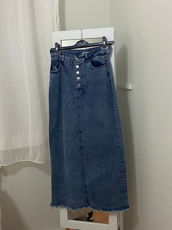 Düğmeli Uzun Mavi Denim Etek - Görsel 2