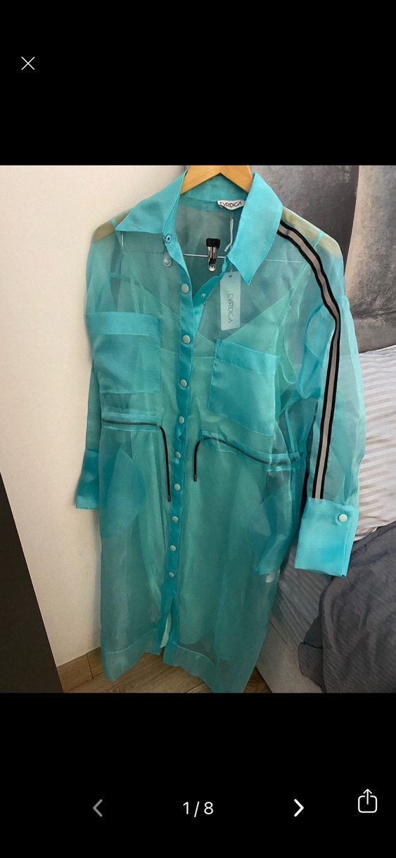 Düğmeli, uzun ve bol kesim mavi parlak sentetik kumaştan kadın elbise astarlı Yakalı ve uzun kollu, yanlarda siyah şerit detaylı, sokak stili için uygun. ️