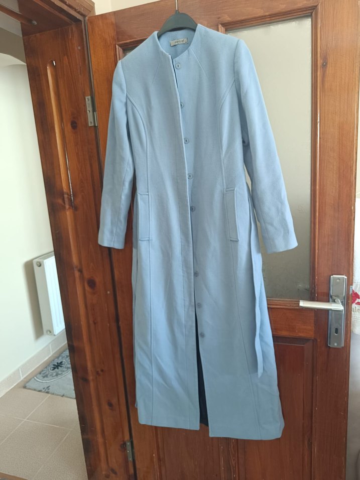 Düğmeli, uzun kesim ve mavi renkte kadın kaban, yakası notched lapel ve uzun kolludur. Ofis için uygun, sade ve düz desensiz tasarıma sahiptir.