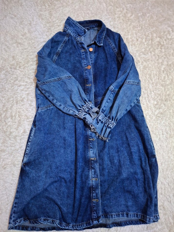 Uzun mavi kot elbise, düğmeli ön ve çentikli yaka ile. Lastikli manşetli uzun kollu, bol kesim, parlak denim kumaşla casual tarz için uygun. Hiç giymedim bir kusuru yok. 36 beden