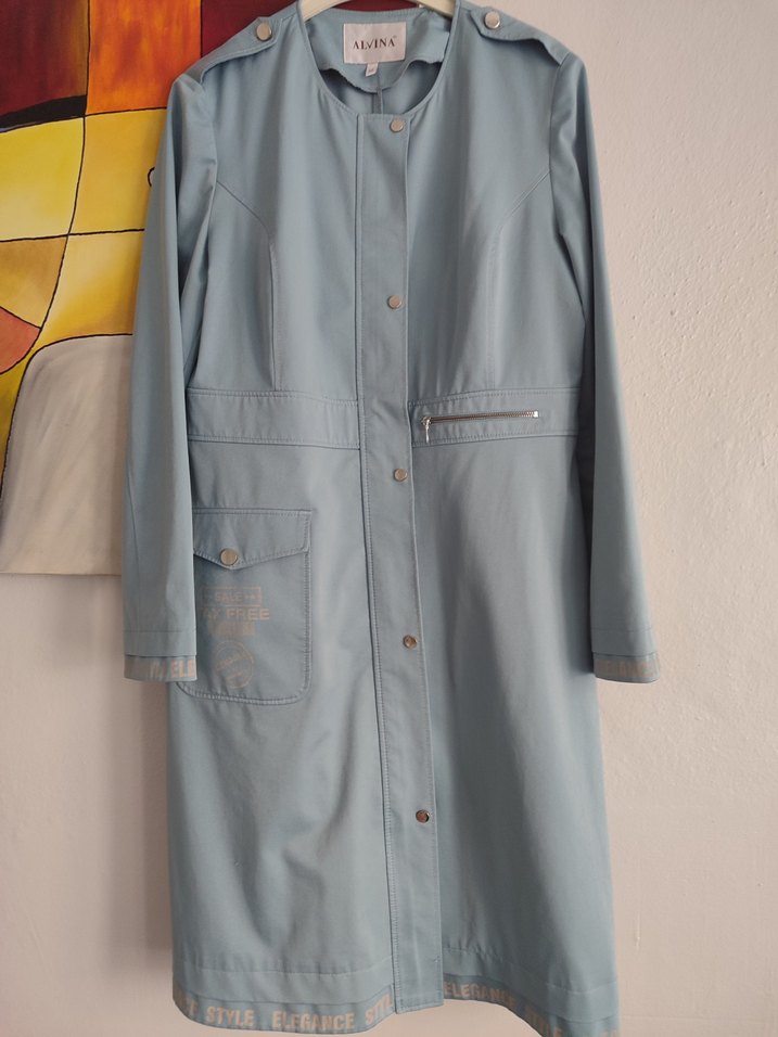 Düğmeli ön kapamalı, uzun kollu ve kesik yakalı uzun mavi yağmurluktur. Sentetik kumaştan üretilmiş, baskılı detaylara sahip, günlük ve sokak stiline uygundur. ️