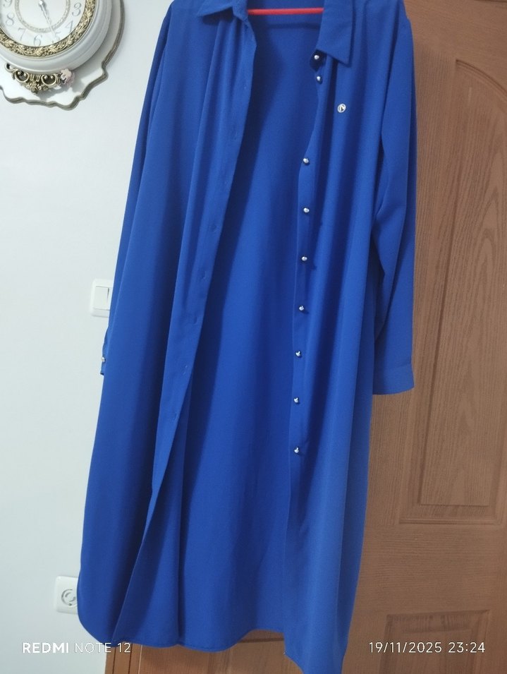 Düğmeli önü ve kesik yaka detaylı, uzun kollu, bol kesim mavi kadın tunik. Pürüzsüz sentetik kumaştan, sade ve şık bir model. ✨