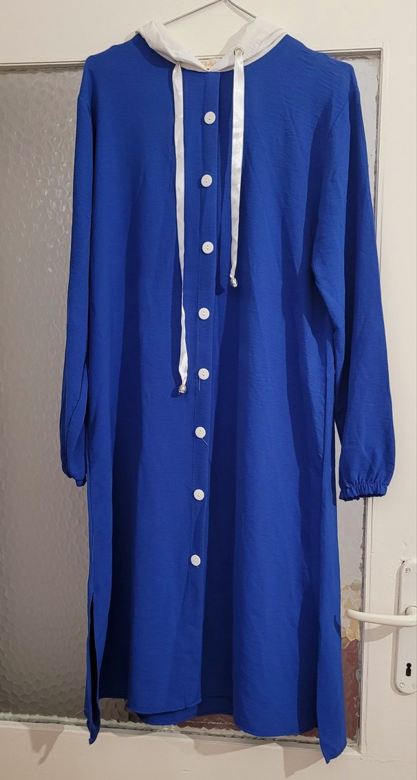 Düğmeli, uzun ve bol kesim mavi kadın tunik. Yaka detaylı, uzun kollu ve parlak sentetik kumaştan üretilmiştir. Rahat sokak stili için uygundur. ✨