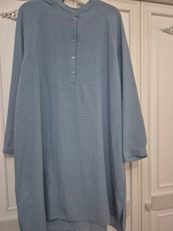 Düğmeli, uzun kollu ve yüksek yakalı kadın tunik. Yumuşak keten kumaştan, bol kesim ve uzun boyda. Mavi renkte, sade ve bohem tarzda.