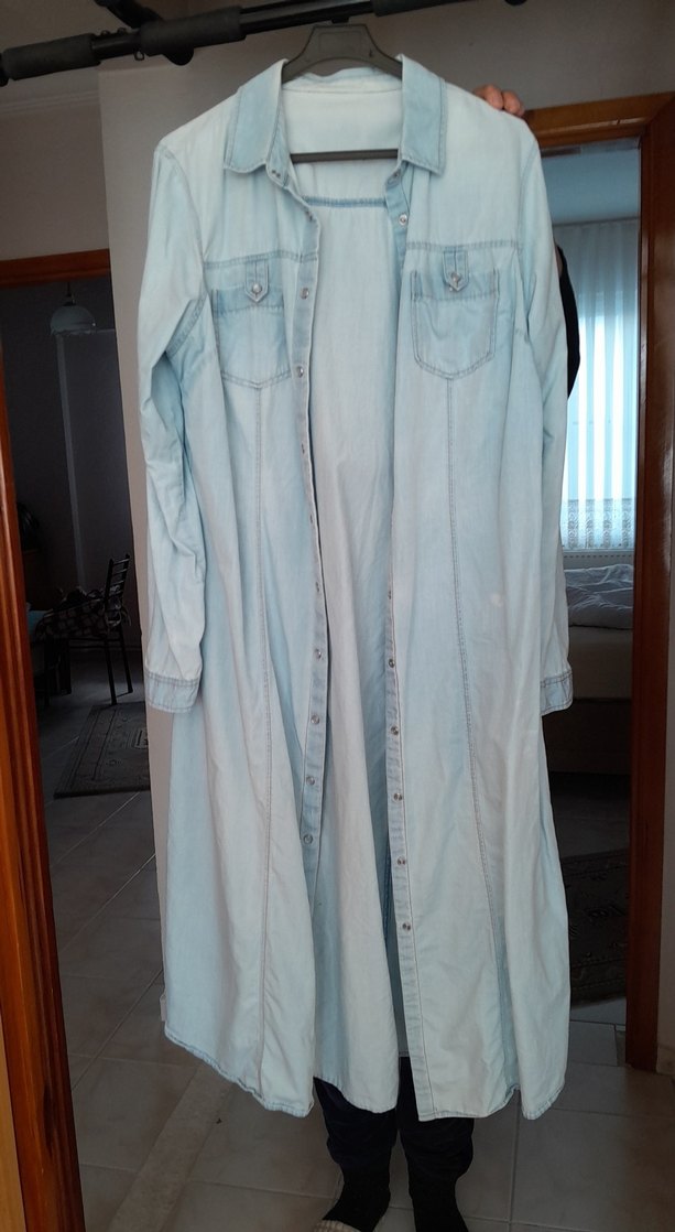 Düğmeli önü ve kesik yaka detaylı, uzun ve bol kesim kot ceketi. Pastel mavi renkte, uzun kollu, günlük kullanıma uygun. 40beden.