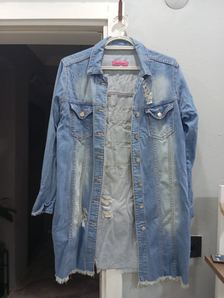 Düğmeli, uzun kesim ve bol fit kot ceket. Uzun kollu, keskin yaka detaylı, günlük kullanıma uygun sade mavi tonlarında.