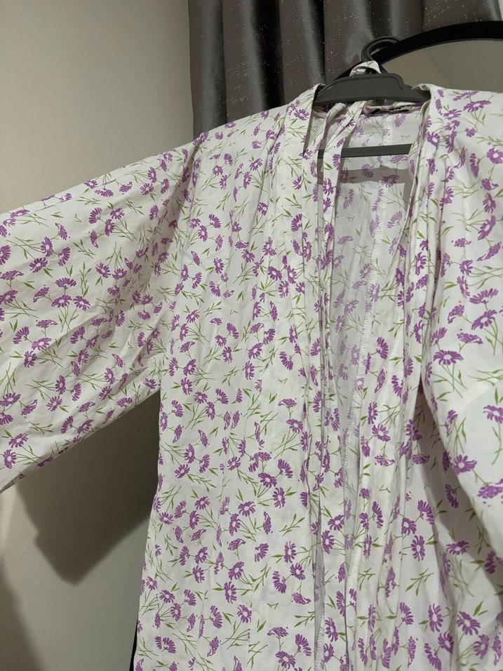 Yumuşak keten kumaştan, düğmeli, uzun boy, V yaka ve uzun kollu, mor çiçek desenli bol kesim kadın kimono.