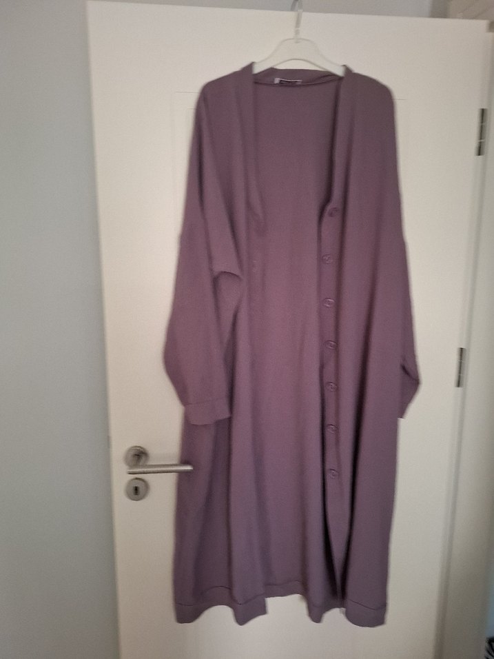 Düğmeli, notlu yaka ve uzun kollu, bol kesim mor kadın hırka. Yumuşak kumaştan, Boy.1.20cm. iki koltuk arası 65cm.