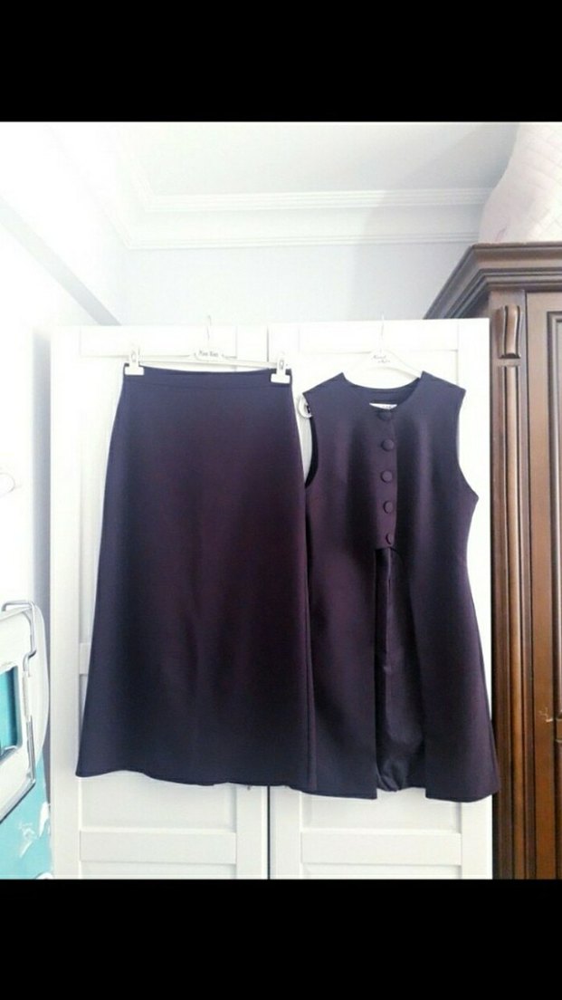 Düğmeli, kolsuz, uzun ve regular fit mor kadın takımı. İpek gibi kumaştan, ofis kullanımı için uygundur. Notch yaka ve uyumlu uzun etek içerir.