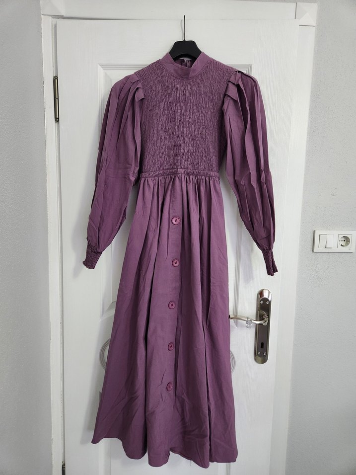 Uzun, yüksek yakalı, düğmeli ve keten kumaştan yapılmış koyu mor renkli bol kesim elbisedir. Vintage bohem tarzındadır ve günlük kullanıma uygundur.