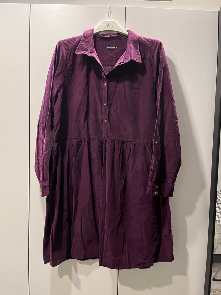 Düğmeli ön kısmı ve yakalı uzun mor keten tunik elbise, bol kesim ve uzun kolludur. Bohem tarzda günlük kullanıma uygundur.