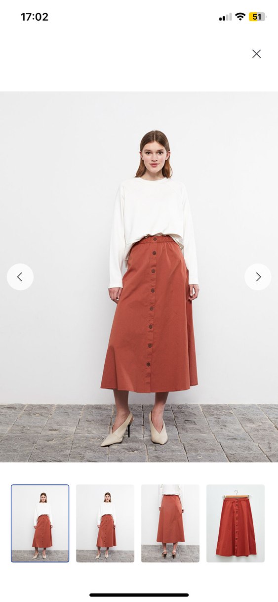 Düğmeli ön kısmı ve bol kesimiyle uzun, bej pamuklu etek, rahat ve zahmetsiz şıklık sunar. Günlük kullanım için uygundur. Arka kısmında hafif çamaşır suyu lekesi var ama çok belirgin değil. Boyum 165 bir tık kısa geldiği için satıyorum