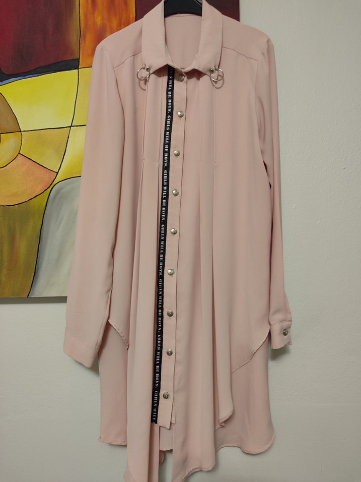 Düğmeli, uzun ve bol kesim kadın tunik. Yumuşak sentetik kumaştan yapılmış, yakalı ve düğmeli önüyle günlük sokak stiline uygun pastel pembe renkte. koltuk altıda lekesi mevcut