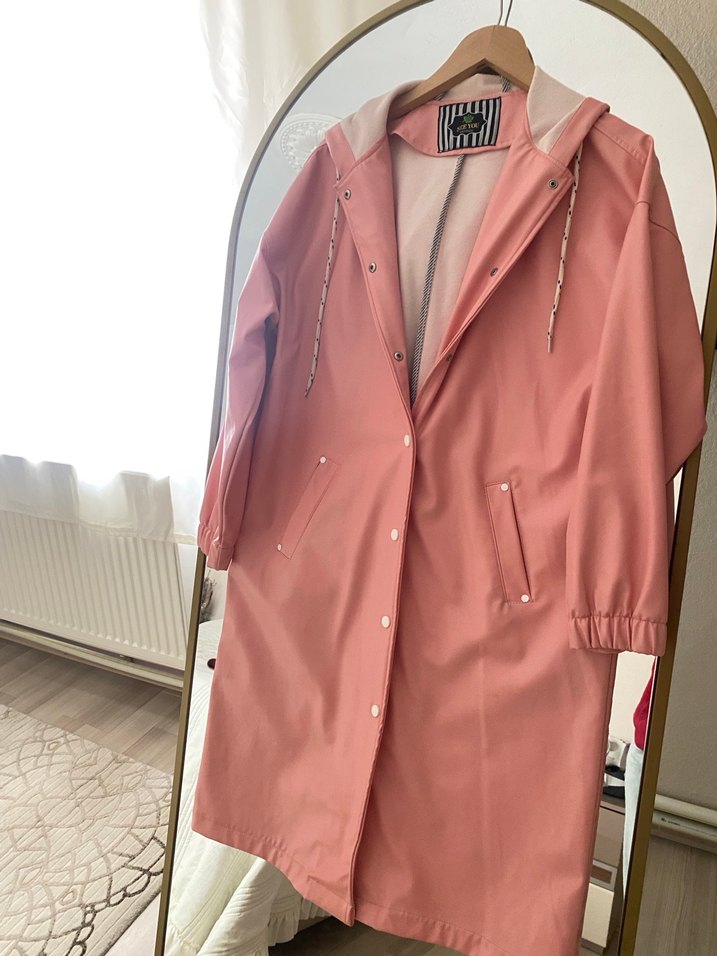Çok eşsiz bir parça aşırı kaliteli tertemiz kilo aldığım için satıyorum çok tarz ve hoş bir yağmurluk tertemiz L bedene de olur benim basenlerim olduğu için sıkıyor aşağıdan salaş kalıbı var yavru ağzı açık pembe arası bir renk