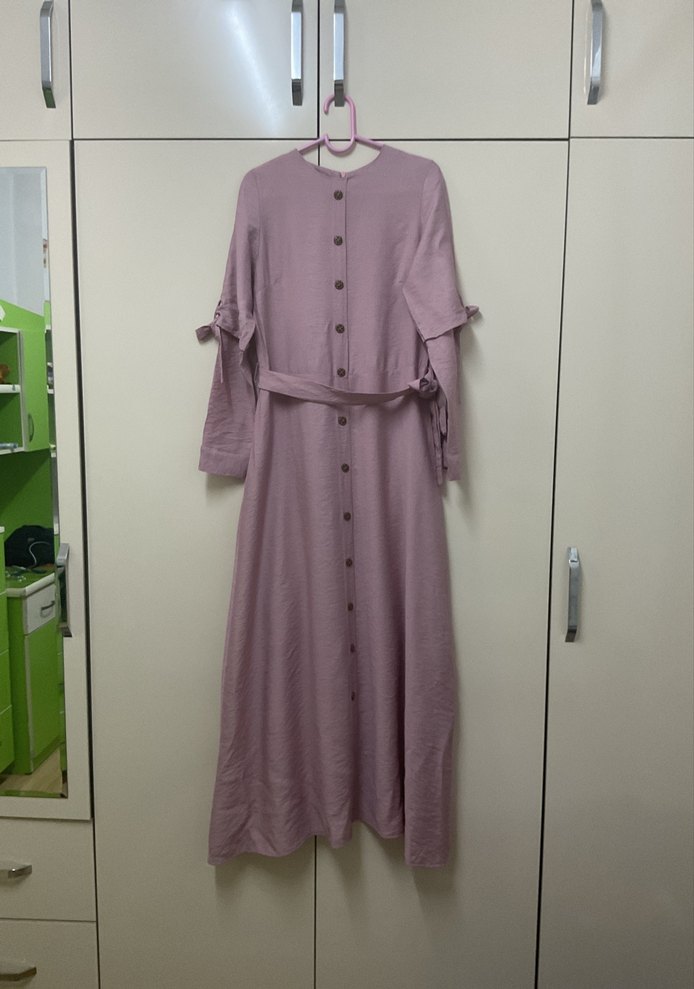Pembe keten kumaştan yapılmış, düğmeli uzun elbise. Bol kesim, uzun kollu ve bağcıklı detaylara sahip. Minimalist ve sade tasarımıyla günlük kullanıma uygundur.
