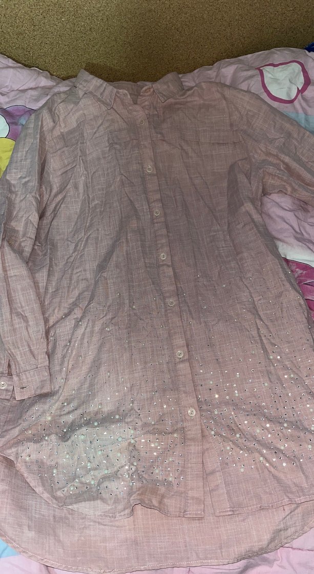 Uzun, düğmeli ve yakalı bu keten kadın gömlek, bol kesim ve uzun kolludur. Pastel pembe renkte, etek kısmında hafif süslemelere sahiptir. Rahat ve bohem tarz için uygundur.