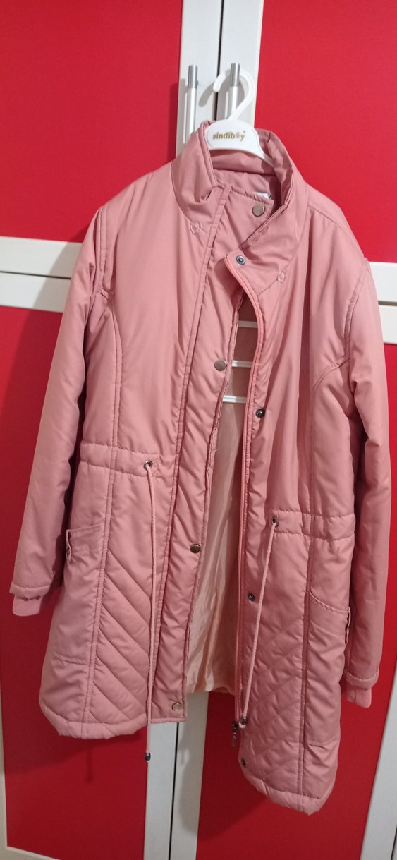 Düğmeli, uzun boy, pembe renkte kadın mont Notch yaka ve uzun kolludur. Rahat kesimi ve yumuşak sentetik kumaşıyla günlük kullanıma uygundur.