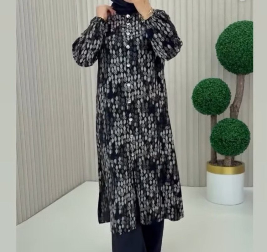 Düğmeli Uzun Siyah Gri Batik Desenli Tunik