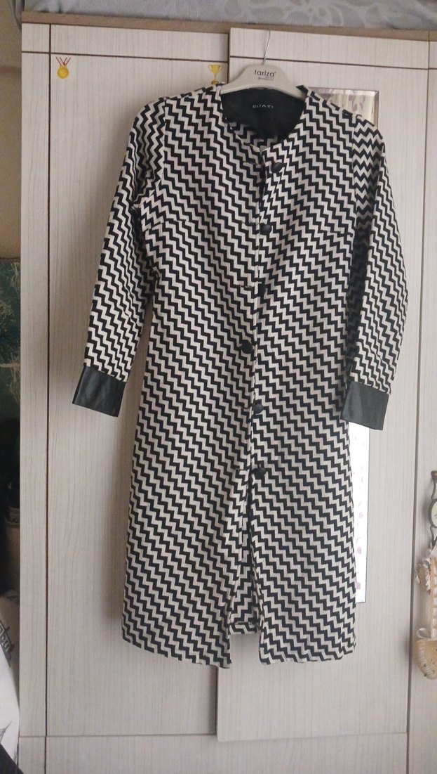 Düğmeli, uzun kollu, regular fit kadın kaban; siyah ve gri yılan deseniyle notlu yaka detayına sahip.