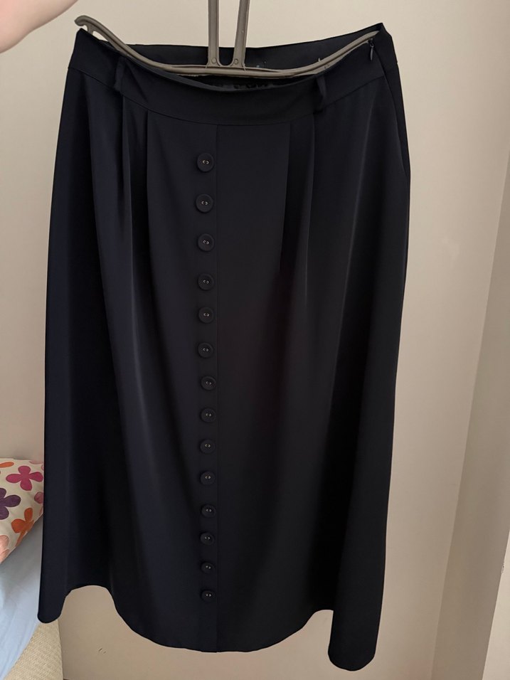 Düğmeli, bol kesim uzun siyah etek. İpeksi kumaştan, ofis için uygun goth ve avangart tarzda.