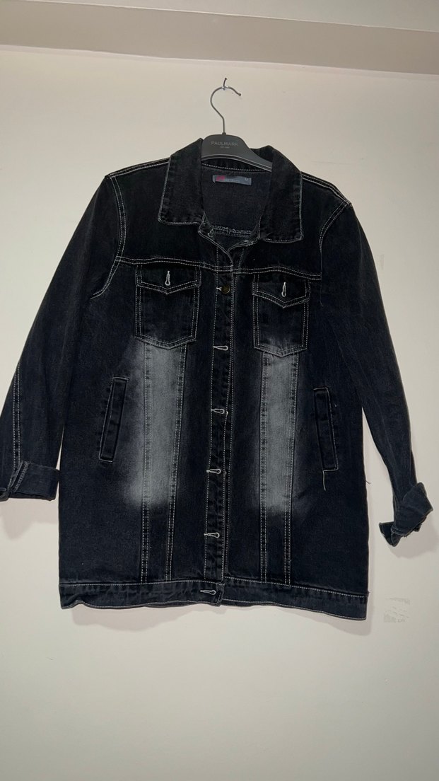 Düğmeli, uzun kollu, siyah kot ceket. Gevşek kesim ve notalı yaka ile midi uzunluğunda, rahat sokak stili için uygun.