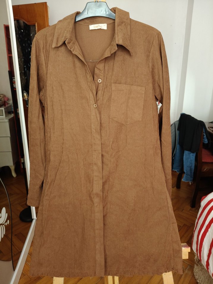 Düğmeli ön cep detaylı, uzun ve bol kesim süet kadın gömleği. Koyu kahverengi, yakası kırmalı ve uzun kollu, günlük rahat sokak stili için uygundur.