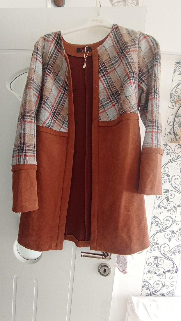 Düğmeli, uzun boy, kahverengi süet ve gri ekoseli kumaş kombinasyonlu kadın kaban. Bohem tarz, kesik yaka ve uzun kollu, rahat kesim.