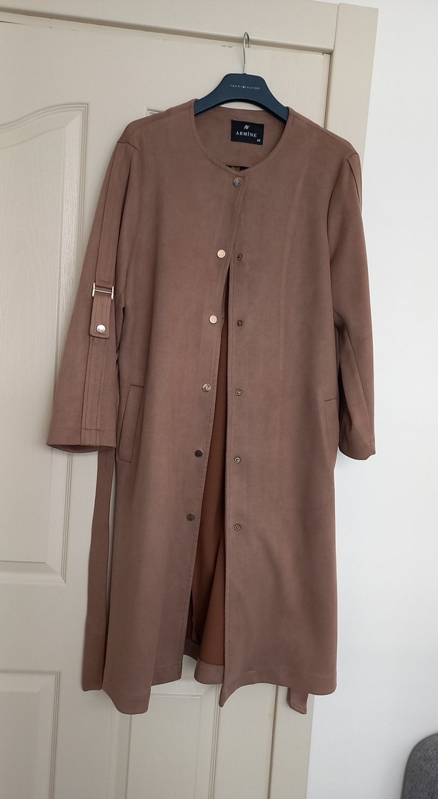Bej renkli uzun süet trençkot, çıt çıtlı koltuk altı 54cm ,boy 1.10cm ve bol kesimdir. Uzun kollu, yakası açık ve ofis stiline uygundur.