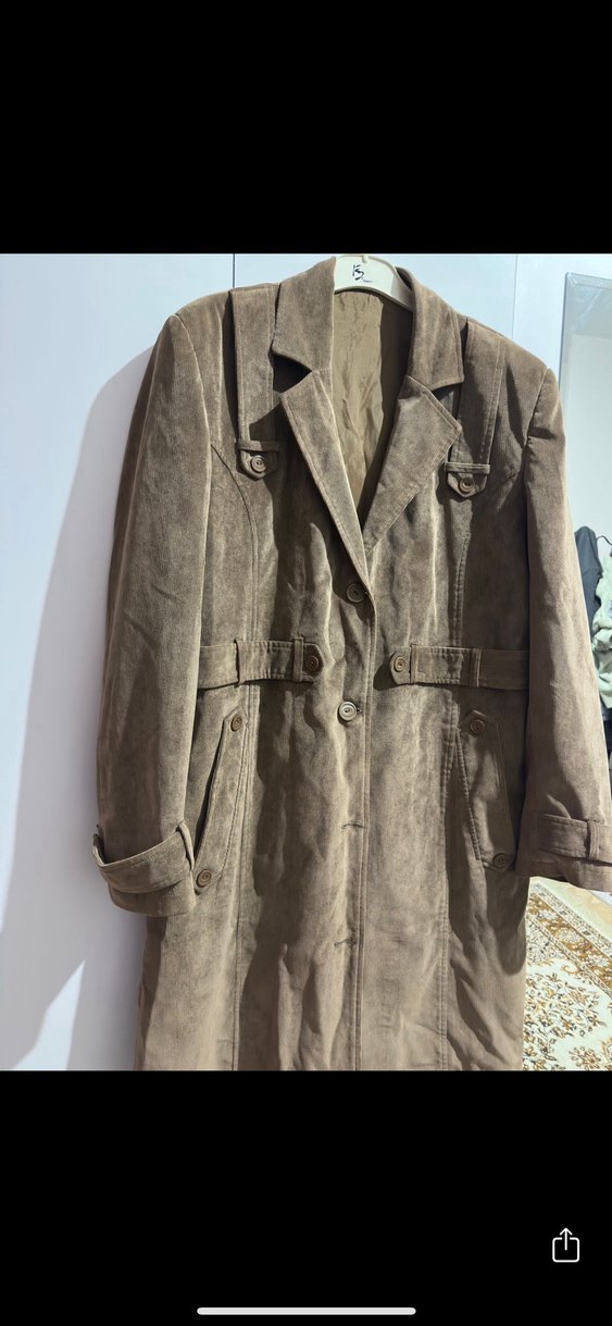 Düğmeli ve kesilmiş yaka detaylı uzun süet kadın trençkot. Kahverengi ve gri tonlarında, uzun kollu, günlük sokak tarzına uygun rahat kesim. Marka temsilidir