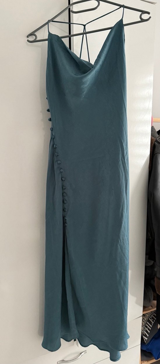 Düğmeli, uzun ve v yaka kesimli bu turkuaz kadın elbisesi, satenimsi kumaş. Bana büyük geldiği için satıyorum.