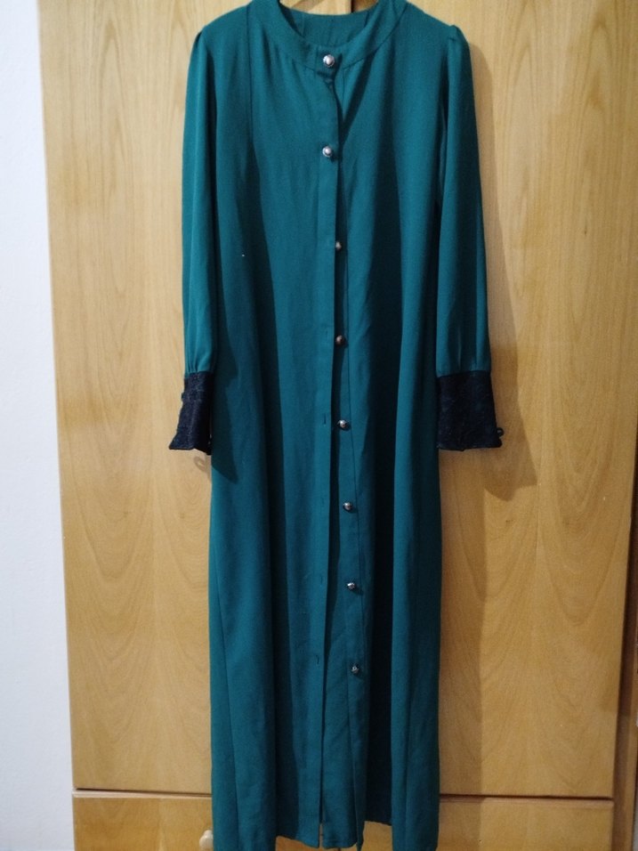 Düğmeli ön kısmı ve dantel detaylı uzun kolları olan, notalı yaka ve bol kesim turkuaz uzun elbise. Ofis kullanımı için uygun, ipeksi kumaştan yapılmıştır. ufak bir defosu var cebin yan kısmında belli değil.