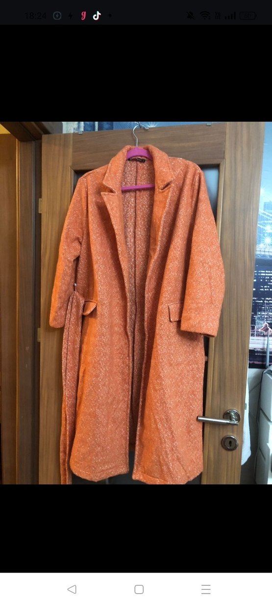 Turuncu uzun kadın kaban, düğmeli ve yakası kesimlidir. Rahat kalıp ve uzun kollu, yumuşak dokulu, günlük kullanıma uygundur. Bu mevsimlere uygundur hiç giyilmedi kusuru yoktur