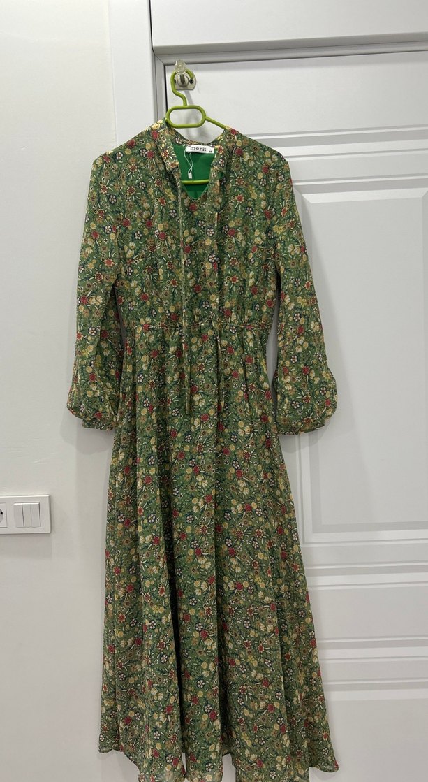 Düğmeli, uzun kollu, yüksek yakalı yeşil elbise. Gevşek kesim ve bohem vintage tarzda, yumuşak sentetik kumaştan yapılmıştır.