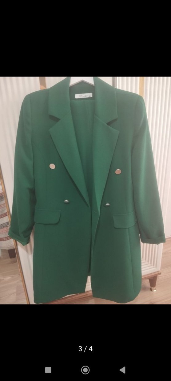 Düğmeli, notched lapel yakalı uzun yeşil kadın blazer ceket. Uzun kollu, parlak renkli ve regular fit. Ofis ve sokak stili için uygun, sentetik kumaştan yapılmıştır. pantolonlu takımdır çok şık iki saat nişanda giydim sadece 36 beden ama 38 bedenede rahat olur 38 bedenim