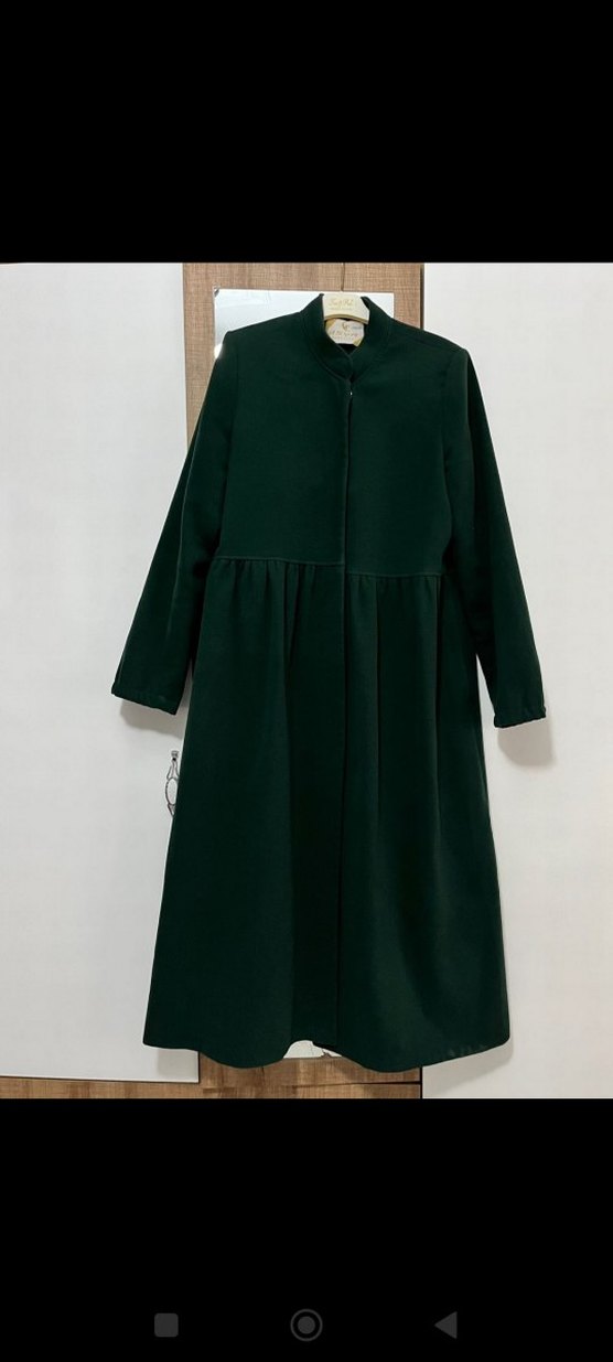 Düğmeli, uzun yeşil kadın kaban, bol kesim ve uzun kolludur. Yumuşak ve sıcak dokulu kumaştan yapılmıştır. Minimalist ve sade tarzda, günlük kullanıma uygundur. almak icn busraa1823 e yaz