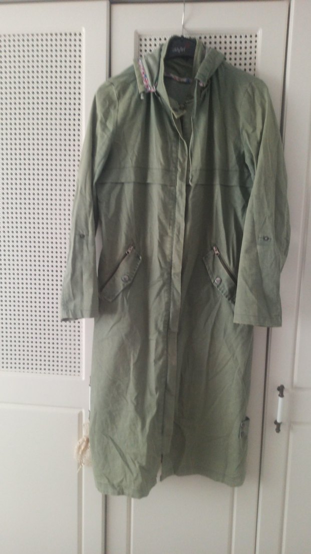 Düğmeli önü, uzun kollu ve kesik yakalı uzun yeşil yağmurluk. Hafif keten kumaştan, salaş kesim ve sokak stiline uygun. Düğmeli cepleri bulunur. ️