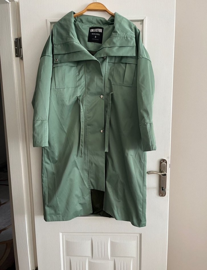 Sentetik kumaştan yapılmış, düğmeli kapamalı, yeşil uzun kadın yağmurluğu. Salaş kesimli, günlük sokak stili için uygundur. ️