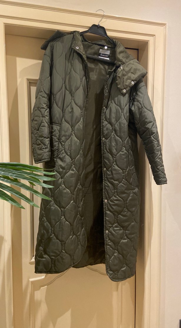 Düğmeli, uzun kahverengi kadın mont, notalı yaka ve sentetik dolgulu kumaş ile sıcak tutar. Günlük sokak stili için uygun, normal kesim ve uzun kolludur.