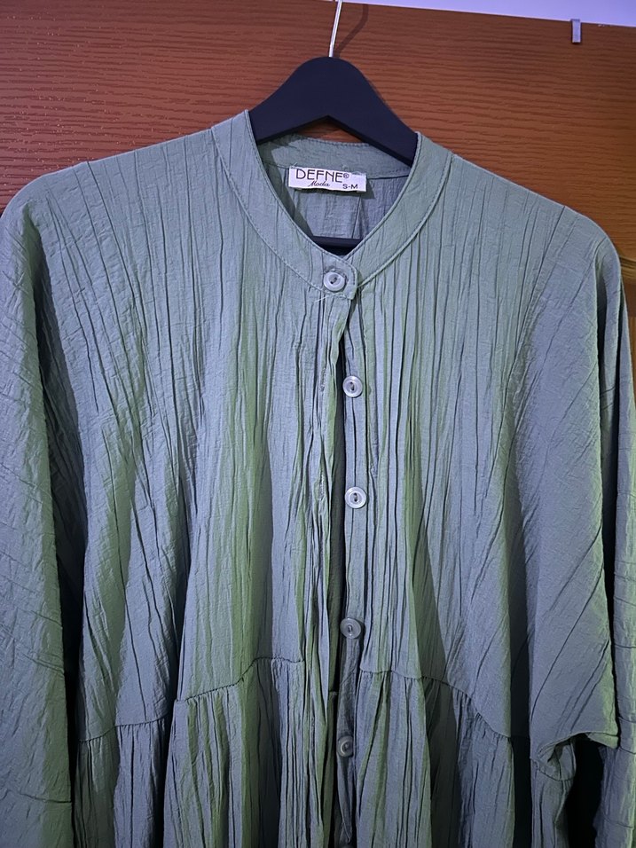 Düğmeli, uzun kollu, keten kumaştan yapılmış yeşil renkli bol kesim hamileliğimde giymek için aldım ve 1 kez giydim yıkandı ütüsüz olduğu için kırışık duruyor sadece. Günlük kullanıma uygun rahat ve şık bir parça.
