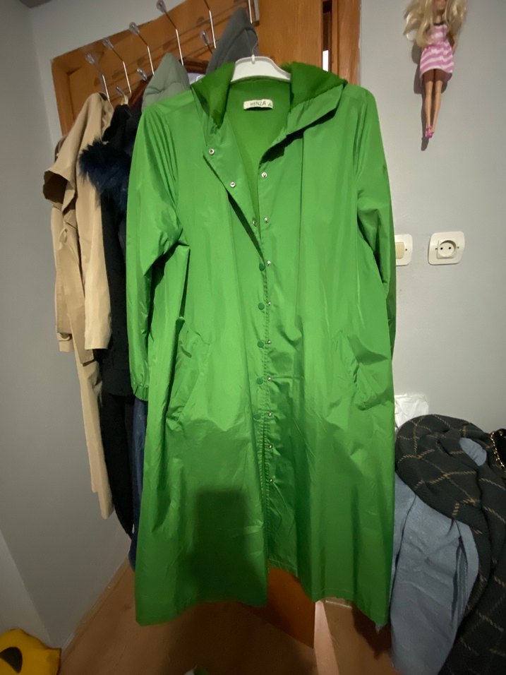 Düğmeli, uzun kol ve bol kesim yeşil yağmurluk. Parlak yüzeyli, çıtçıtlı ve sade tasarımlı, günlük sokak stiline uygun. ☔️