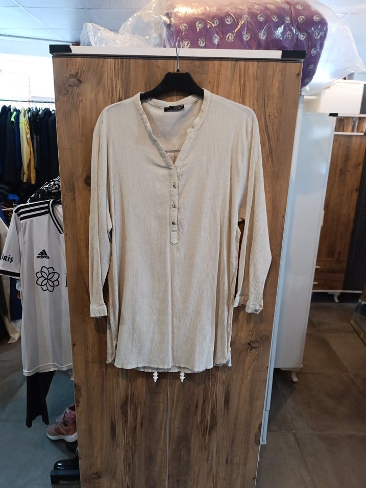 Düğmeli, V yakalı, uzun kollu bej keten kadın gömlek. Rahat kesim ve midi boy ile günlük bohem tarzda kullanıma uygun.