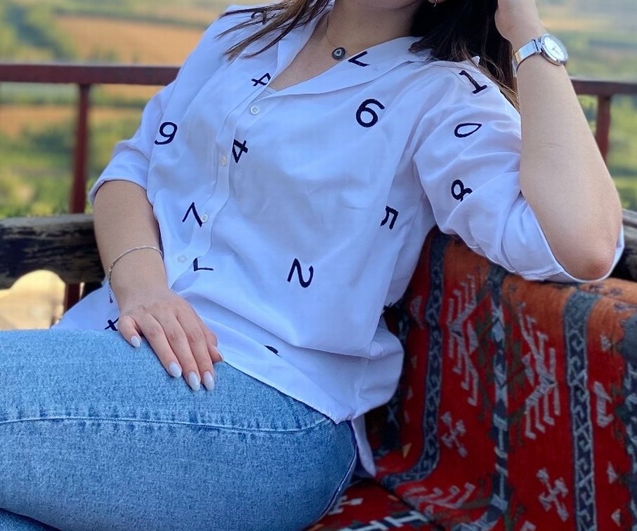 Beyaz, düğmeli, V yakalı, kısa kollu, bol kesim kadın gömlek. Üzerinde baskılı sayılar bulunur. Hafif sentetik kumaştan, günlük kullanıma uygun.