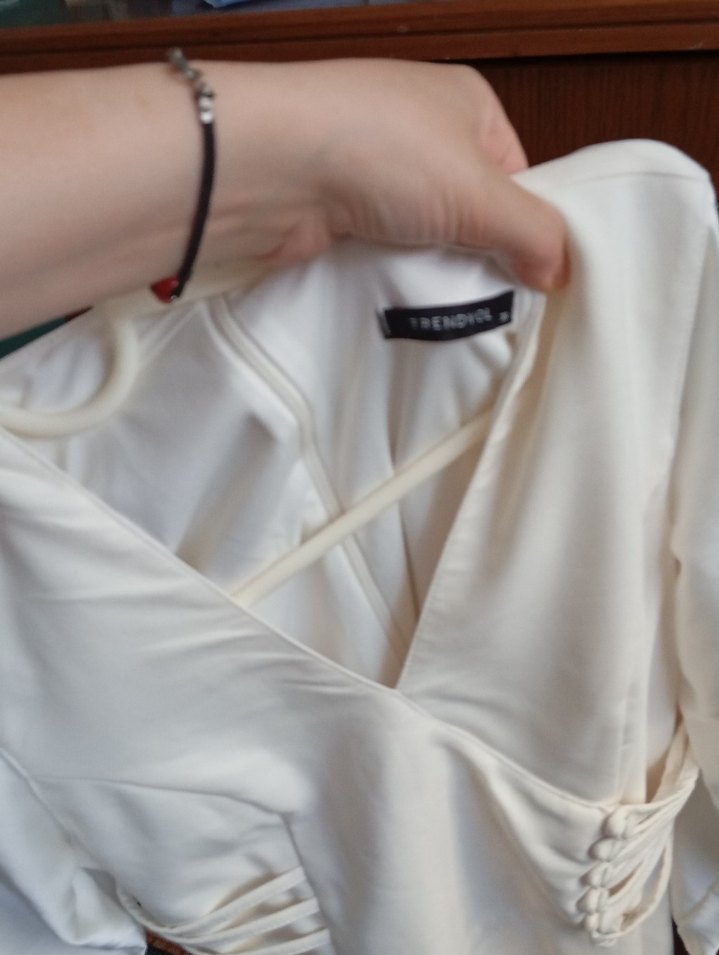 Düğmeli, V yakalı, beyaz elbise günlük ve özel bir yerde giyilir. İnce askılı, normal midi boyda, satenimsi kumaştan yapılmıştır. Günlük kullanım için uygundur.