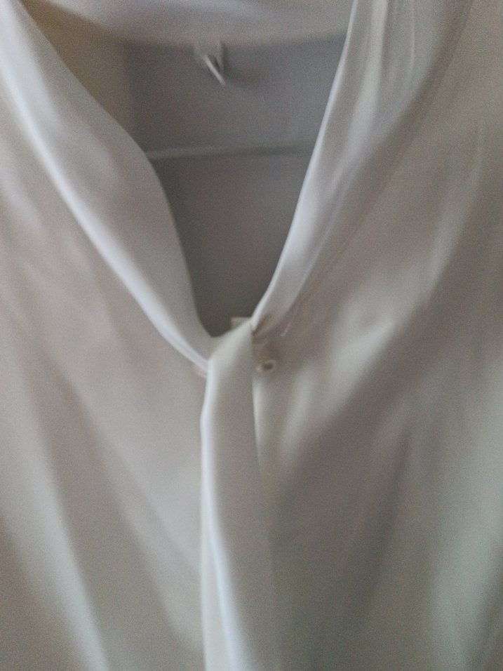 Düğmeli, V yakalı ve kolsuz bu beyaz hamile bluzu, parlak ve ipeksi dokusuyla düğünler için uygundur.