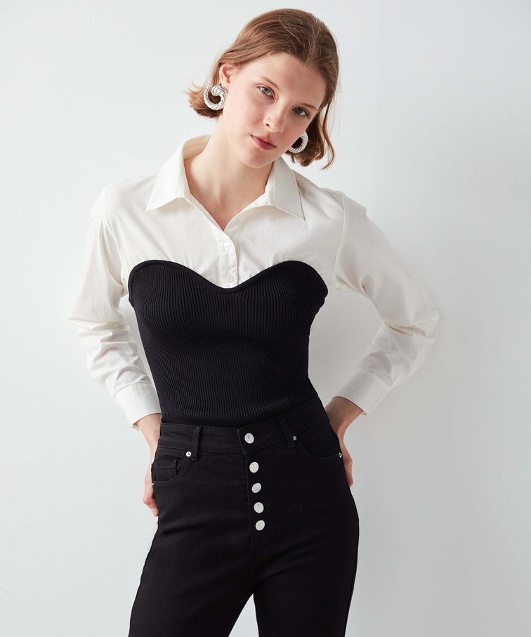 Pamuk kumaştan yapılmış, düğmeli ve V yakalı beyaz gömlek. Uzun kollu, normal boyda ve ofis için uygun, klasik normcore tarzında.