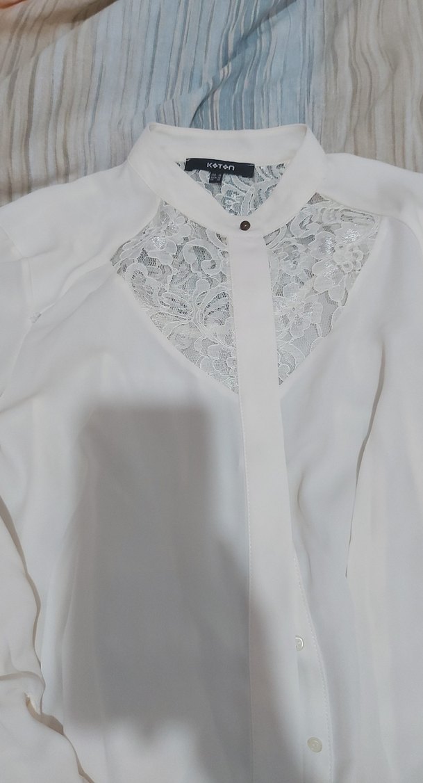 Düğmeli, V yakalı beyaz kadın gömlek, göğüs kısmında dantel detaylıdır. Pamuklu kumaştan üretilmiş, ofis için uygun, normal kesimdir.
