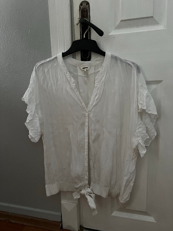 Beyaz kumaştan kısa kollu, V yaka ve bol kesim kadın gömlek. Düğmeli detaylı ve bağcıklı etek ucu ile günlük kullanıma uygun rahat stil.