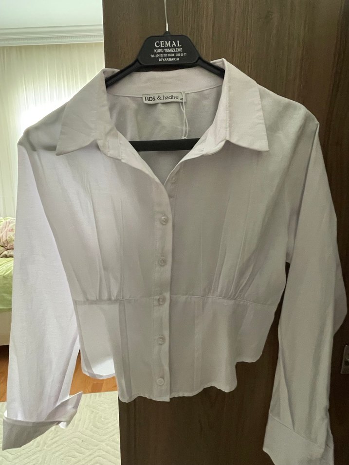 Düğmeli ve V yakalı, uzun kollu beyaz keten gömlek, normal boyda ve dar kesimdir. Günlük ve ofis kullanımı için uygundur. Hiç giyilmedi büyük geldi etiketi yok sadece